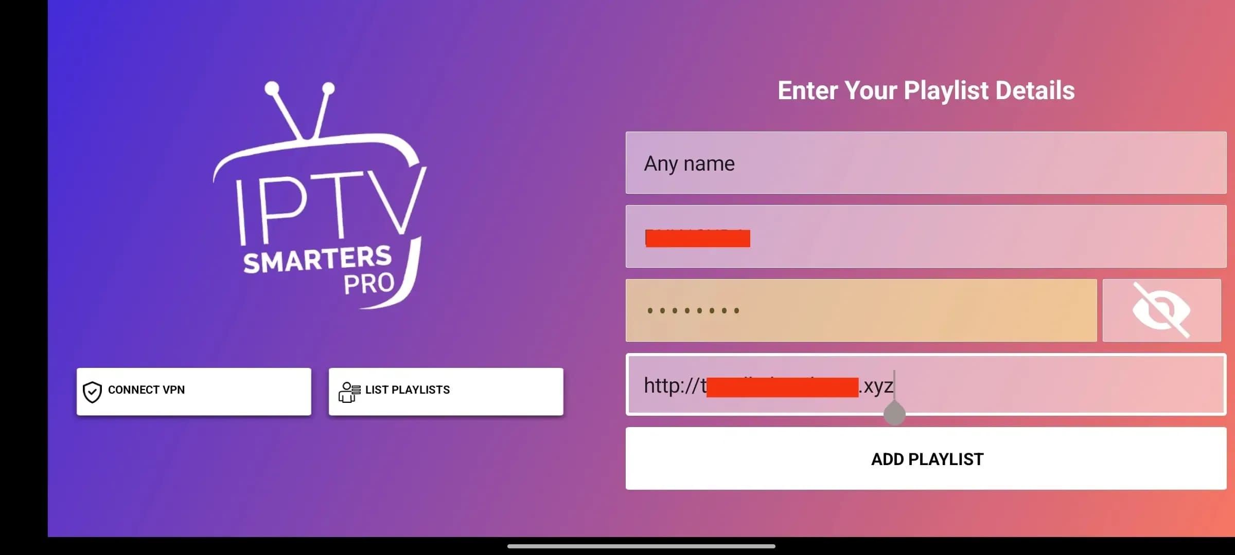 On the Xtream Codes API screen, carefully enter the Playlist Name, Username, Password, and Portal URL provided in your subscription email. Then tap Add User.